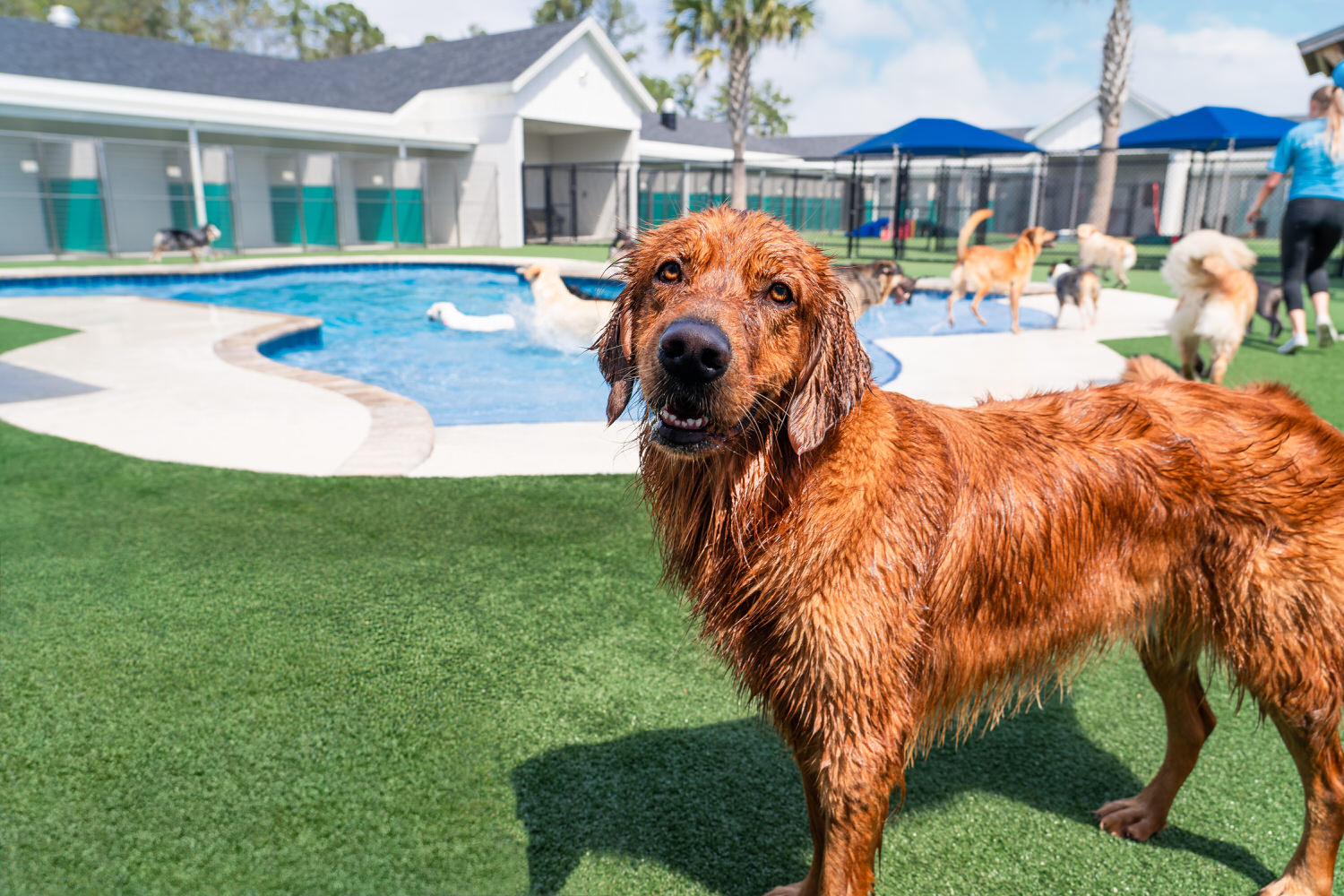 Treat your dog to a day of play in Paradise Park's dog daycare, featuring shady covered porches, trees, misting stations, and a bone-shaped swimming pool and splash area. 2nd+ dogs are 20% off. Please check our One-on-One rates is your dog is over 6 months of age and not spayed or neutered or if they do not play well with other dogs.